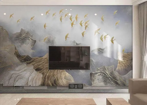 Fotomurales Un maravilloso paisaje con montañas y pájaros se dibuja a partir de finas líneas Nr. u44870