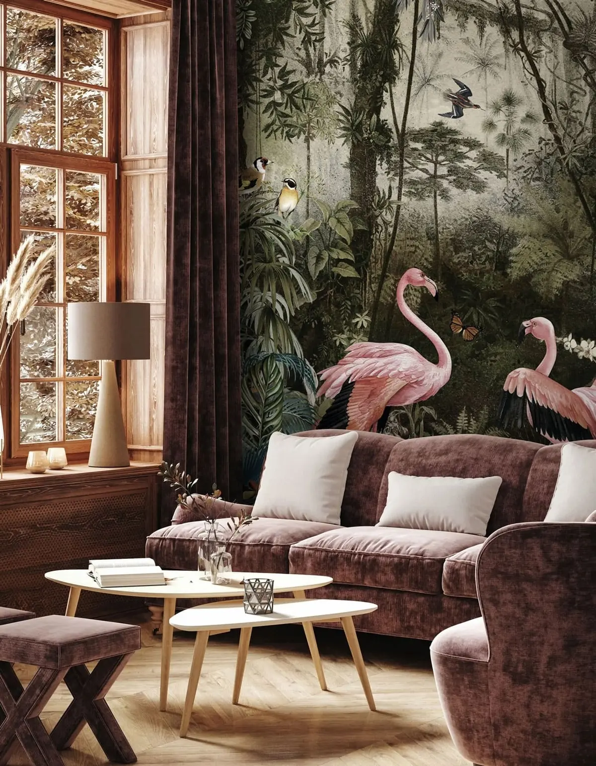 Fotomurales Pájaros tropicales y flamencos en la jungla Nr. u73568