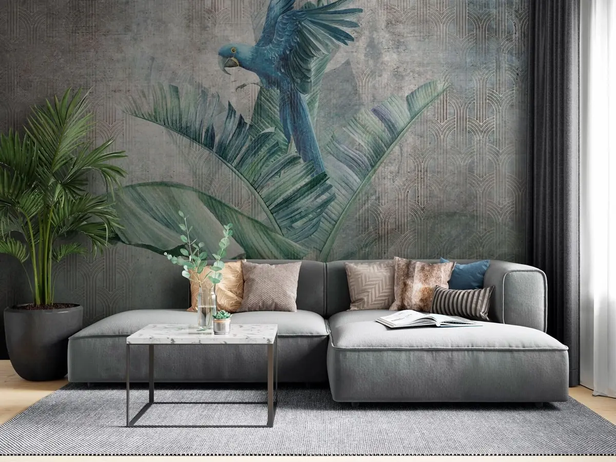 Fotomurales Gran loro azul en árbol de plátano con textura de hormigón grunge Nr. u95432