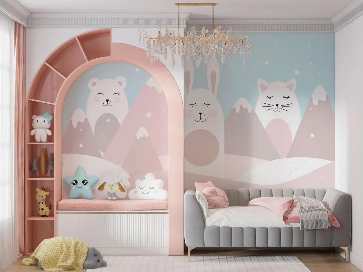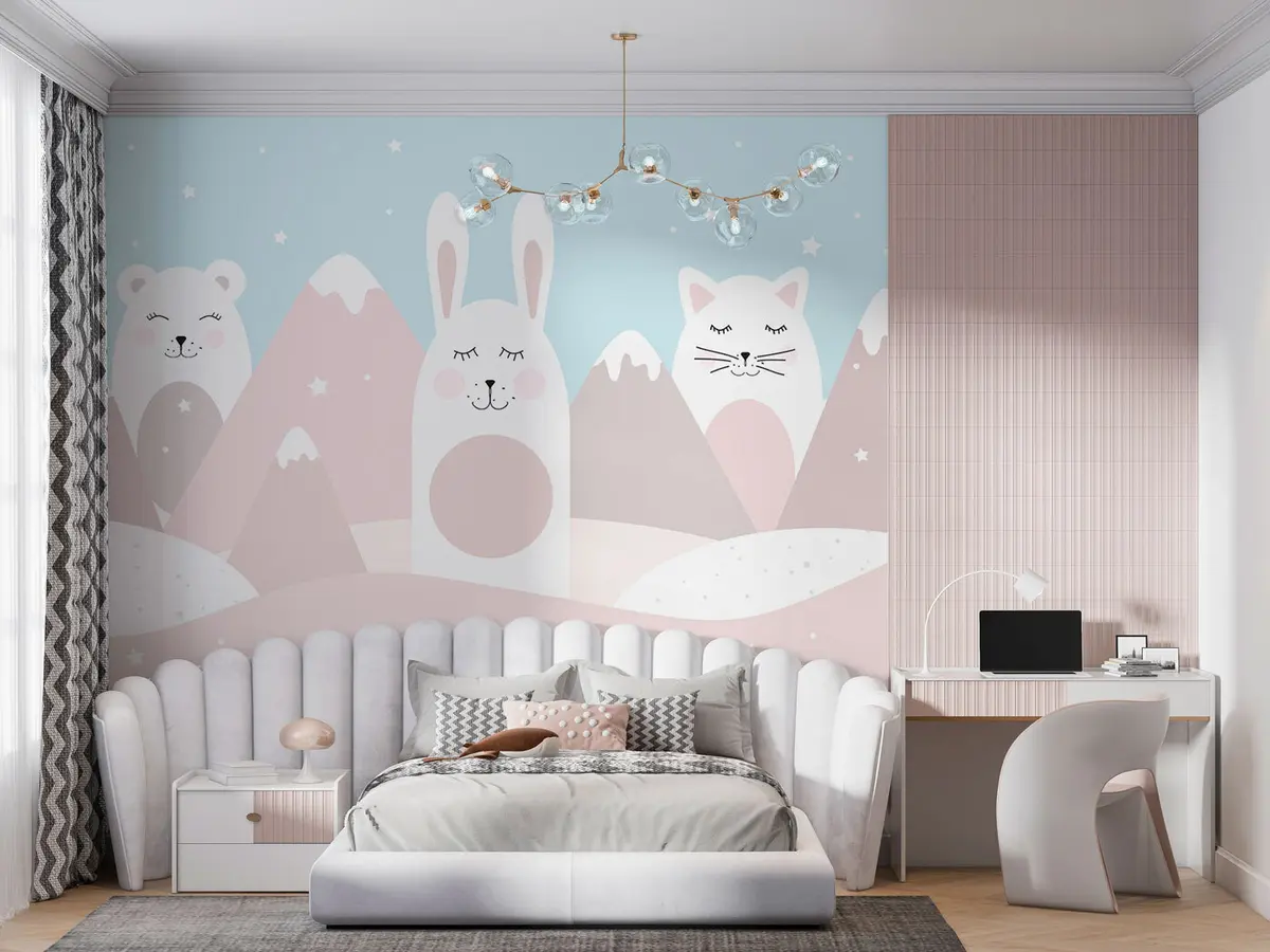 Fotomurales Conejo, oso, zorro sobre un fondo de montañas nevadas de color beige Nr. u98135
