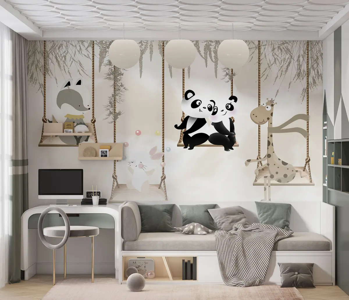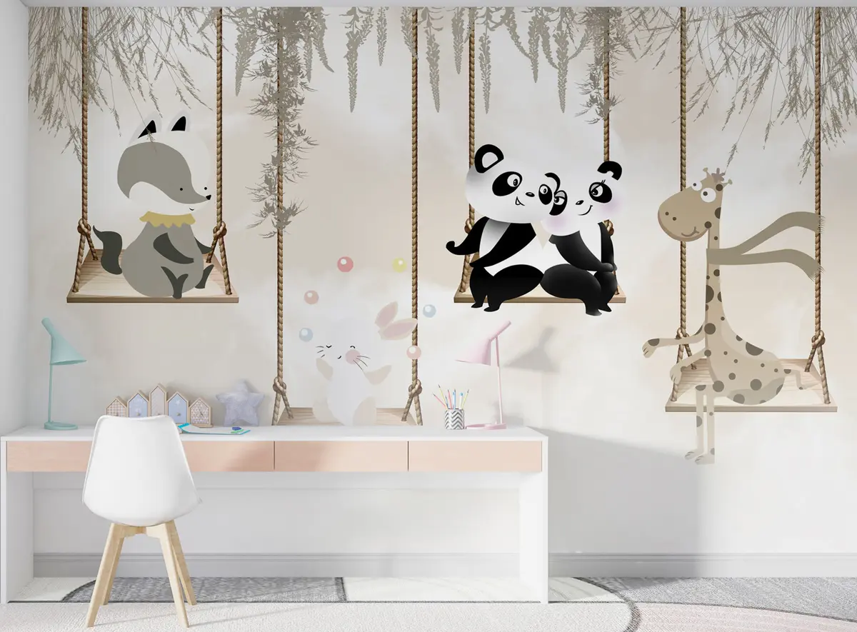 Fotomurales Diseño de papel pintado para habitación infantil con jirafa, mapache, liebre y pandas en los columpios Nr. u98972