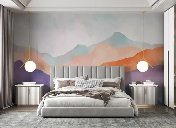 Fotomurales Paisaje de montaña, dibujo abstracto, estilo boho, naranja, pupila, azul Nr. u98991