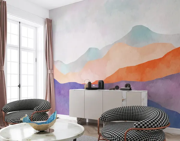 Fotomurales Paisaje de montaña, dibujo abstracto, estilo boho, naranja, pupila, azul Nr. u98991