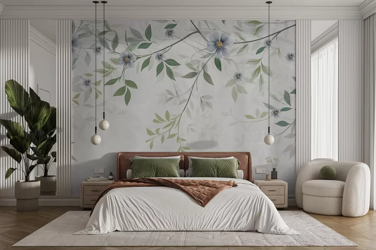 Fotomurales Ramas con hojas verdes y flores azules Nr. w00316