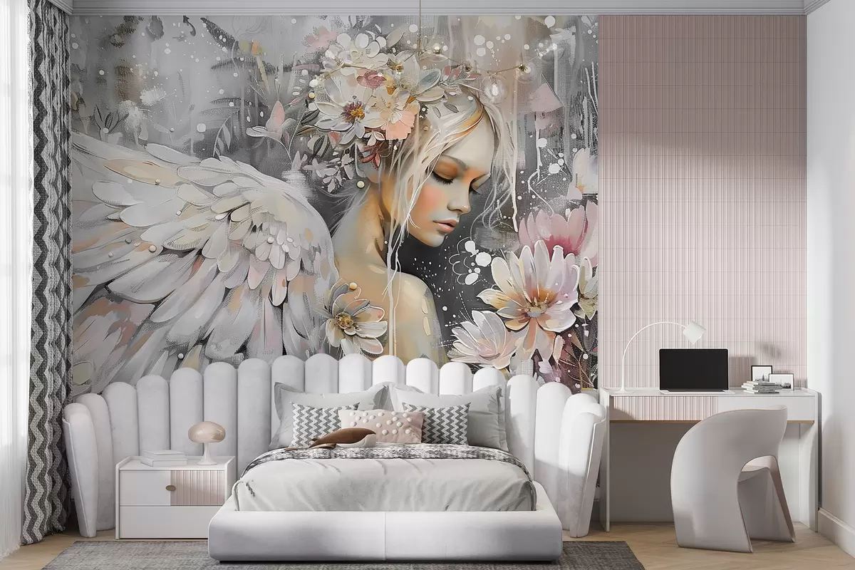 Fotomurales Niña ángel sobre un fondo gris pintado al óleo Nr. w00761