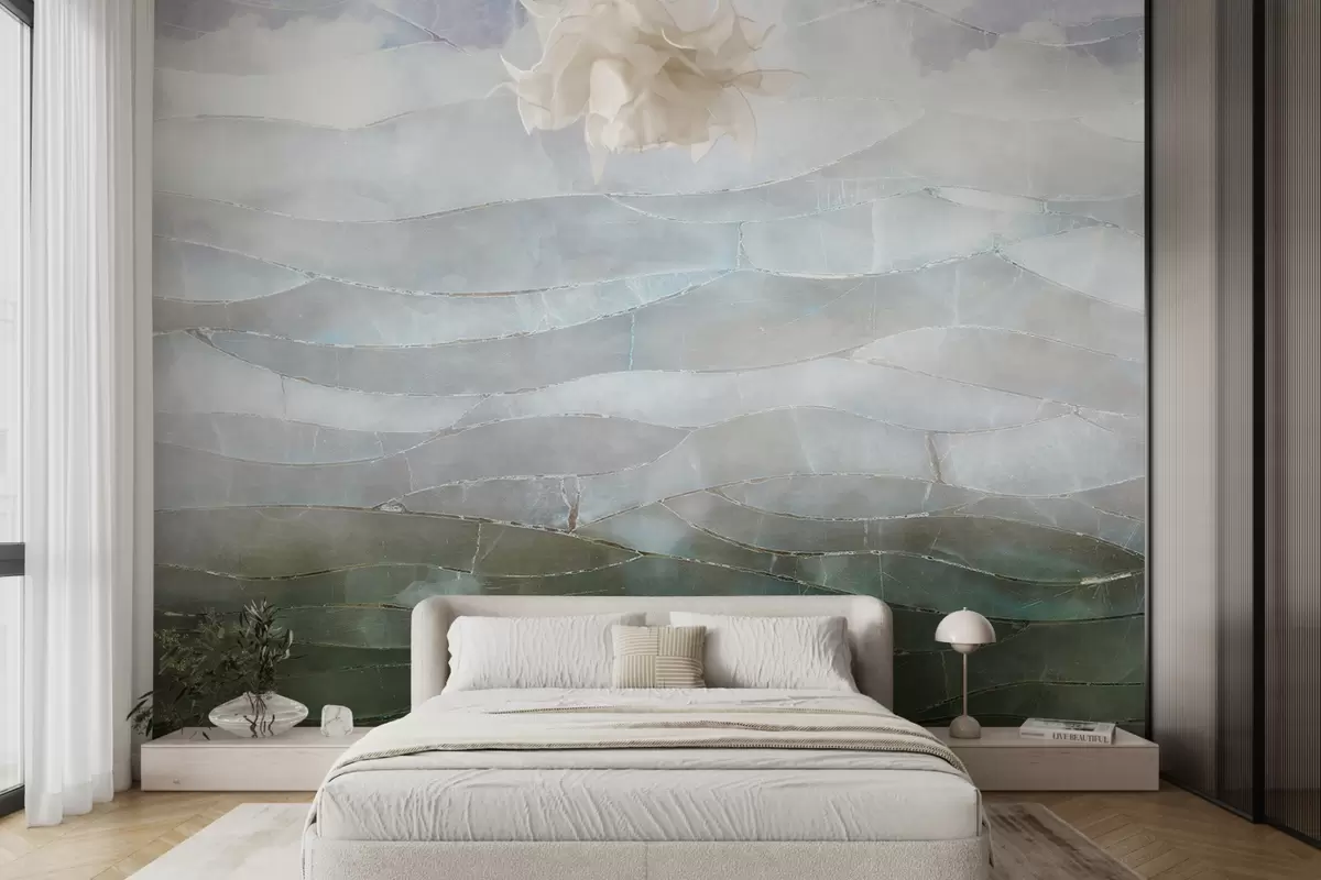 Fotomurales Paisaje texturizado de gradiente abstracto, montañoso y brumoso con campos verdes ondulados a través de la niebla Nr. w00795
