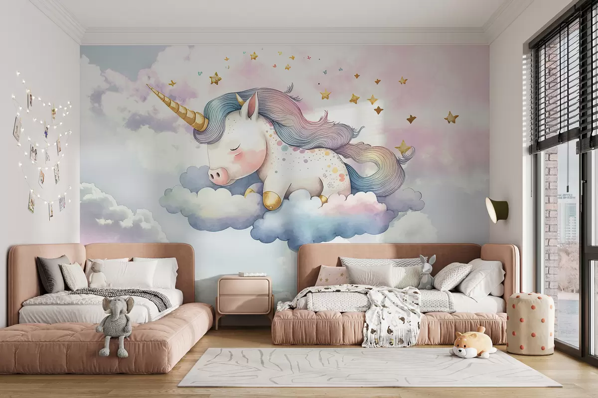 Fotomurales Un unicornio blanco con melena y cola de arco iris descansando sobre una nube en un cielo de color pastel con estrellas Nr. w00799