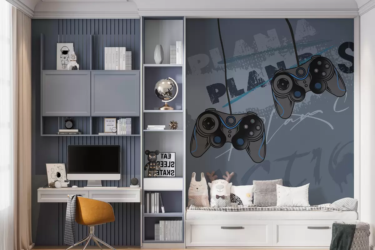 Fotomurales Papel pintado infantil para adolescente con joysticks y letras gráficas en azul Nr. w00829