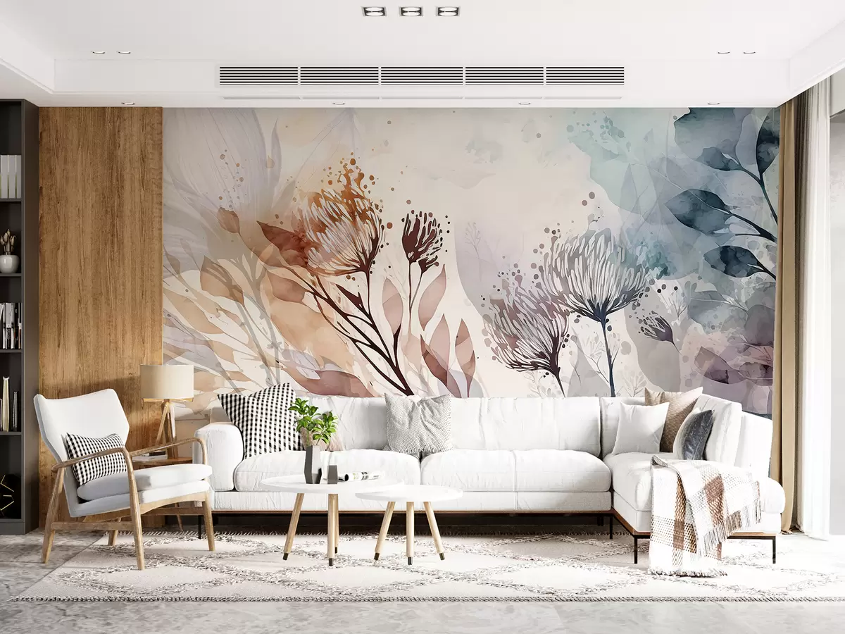 Fotomurales Delicados elementos florales abstractos, flores estilizadas y formas vegetales en tonos apagados y terrosos, arte acuarela Nr. w00898