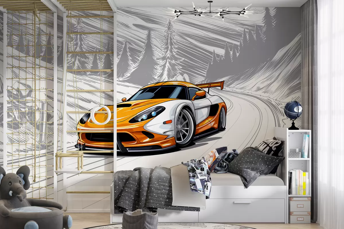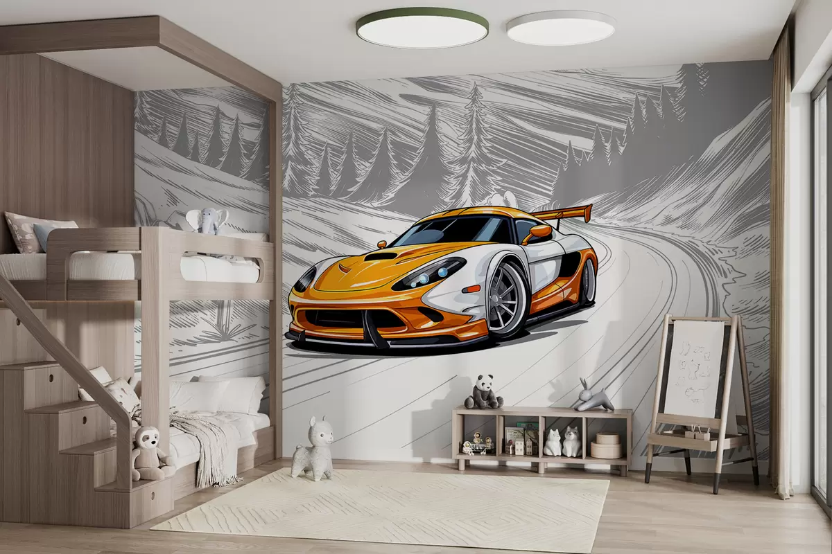Fotomurales Un coche deportivo naranja sobre un fondo gris con una carretera llena de baches entre montañas y abetos. Para decorar la habitación de un niño Nr. w00954