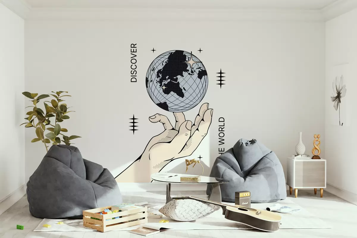 Fotomurales Mano beige girando el globo sobre un fondo blanco para la decoración de la habitación o la oficina Nr. w00984