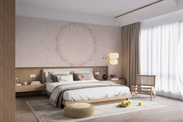 Fotomurales Mandala redondo, papel pintado para espacio de yoga o para armonizar el espacio personal. Mandala mural en cálidos colores pastel sobre fondo irregular texturizado Nr. w01088