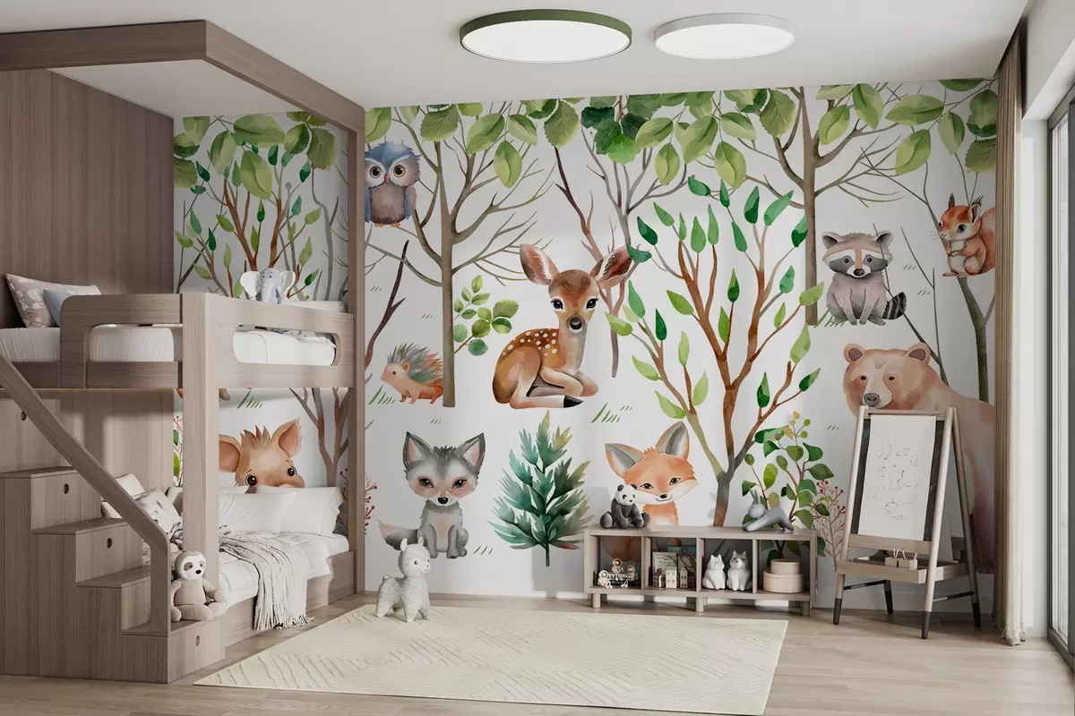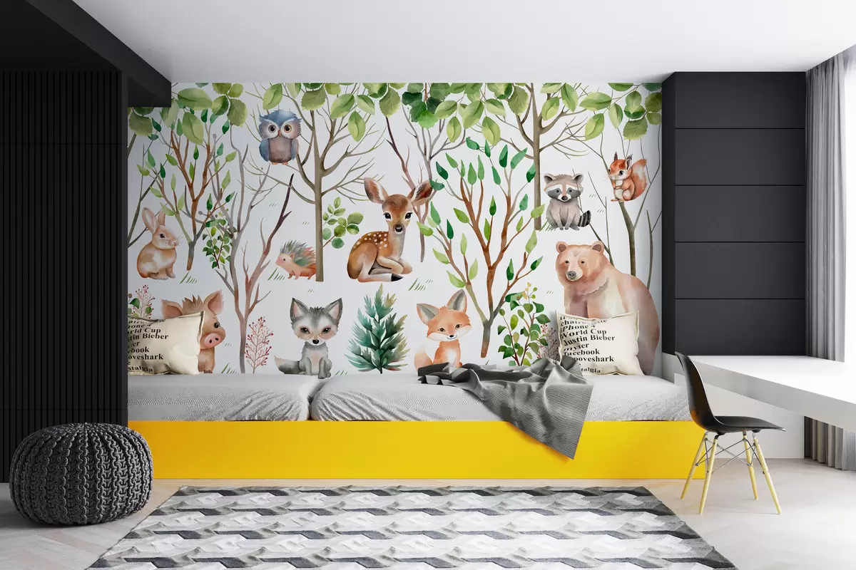Fotomurales Papel pintado infantil animales del bosque. Papel pintado de colores sobre fondo blanco Nr. w01127
