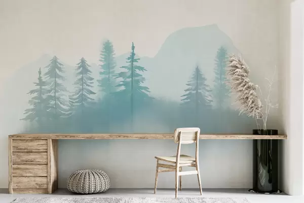 Fotomurales Delicado paisaje en tonos azules con abetos en técnica de acuarela sobre fondo blanco Nr. w01142