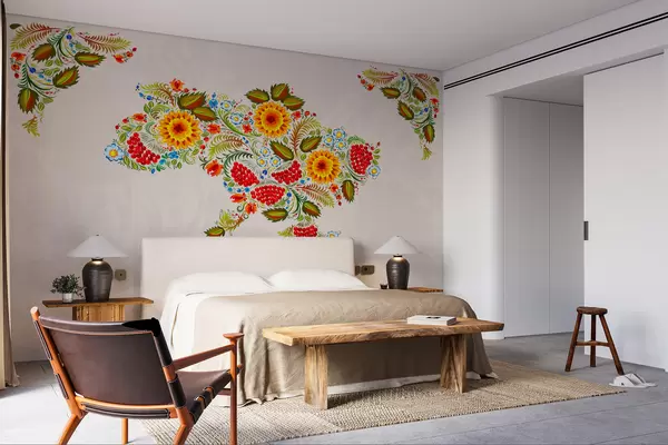 Fotomurales Mapa de Ucrania pintado al estilo de Petrikov sobre fondo beige claro Nr. w01149