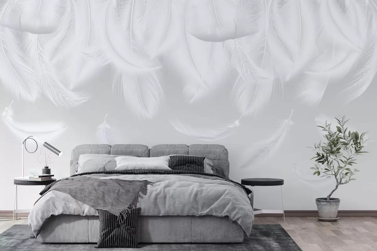Fotomurales Delicadas plumas blancas cayendo desde arriba sobre un fondo gris cálido Nr. w01150
