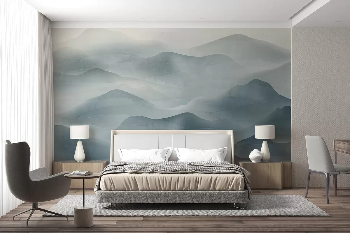 Fotomurales Paisaje de montaña con colinas y niebla que crean una escena serena y atmosférica. Nr. w01254