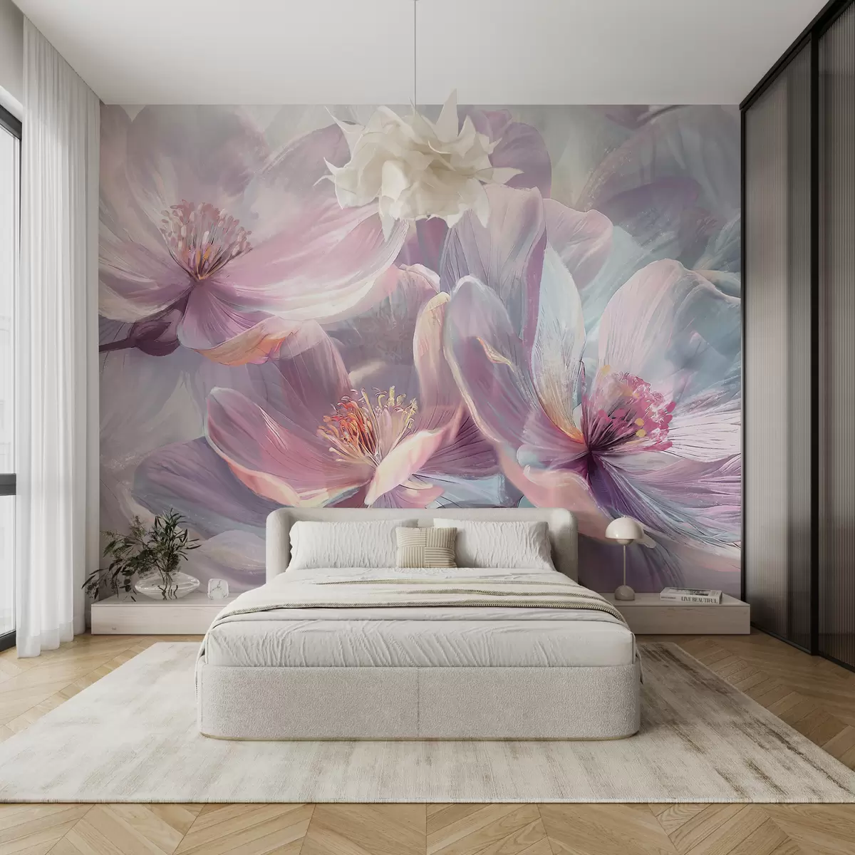 Fotomurales Delicadas flores transparentes de neón pastel, rosa claro y blanco, con fondo suave y borroso Nr. w01307