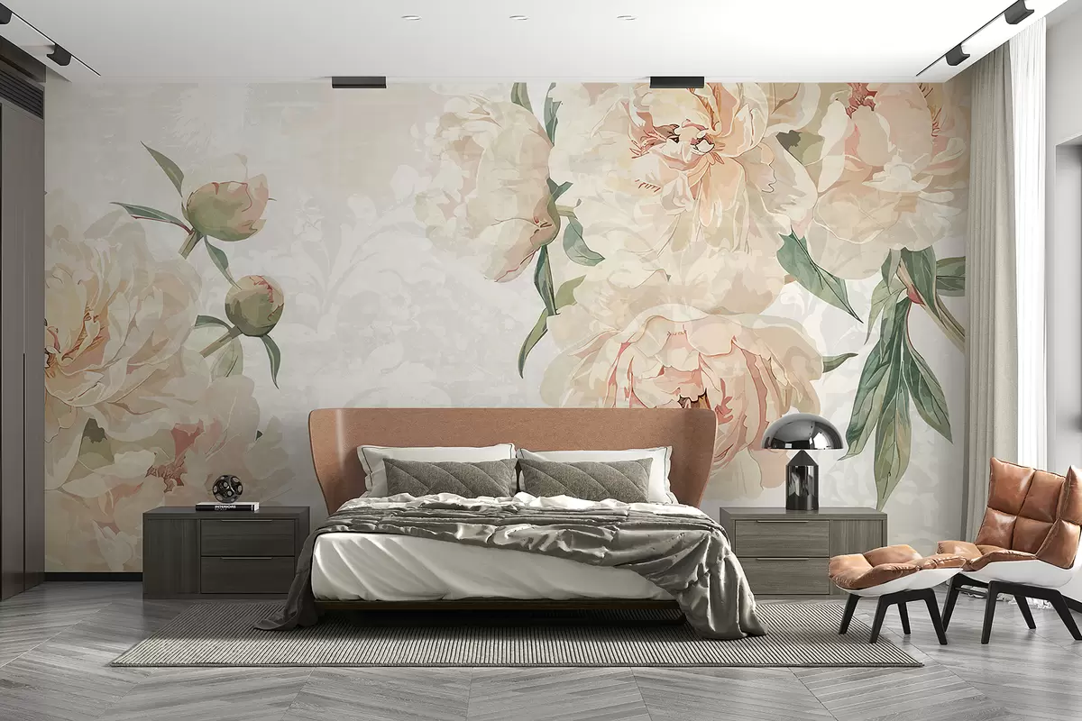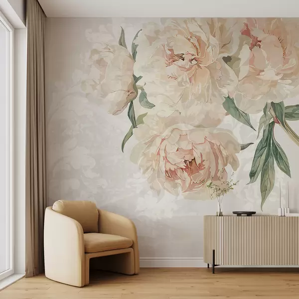 Fotomurales Peonías grandes y delicadas de color melocotón con hojas verdes sobre un fondo de textura suave y ligera Nr. w01308