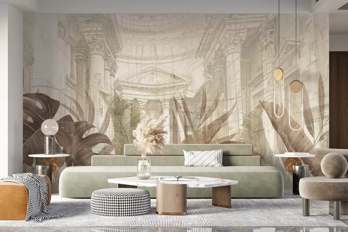Fotomurales Un gran dibujo arquitectónico adornado con columnas de mármol y exuberantes plantas tropicales de color sepia. Nr. w01311v1