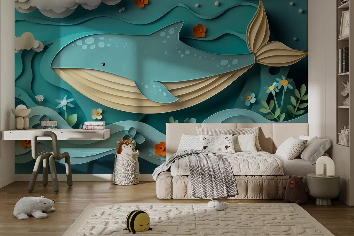 Fotomurales Ballena juguetona en las nubes en estilo de corte de papel, efecto 3D Nr. w01496