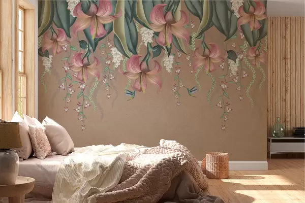 Fotomurales Delicado motivo botánico con lirios colgantes, flores y colibríes en una pared grunge Nr. w01523
