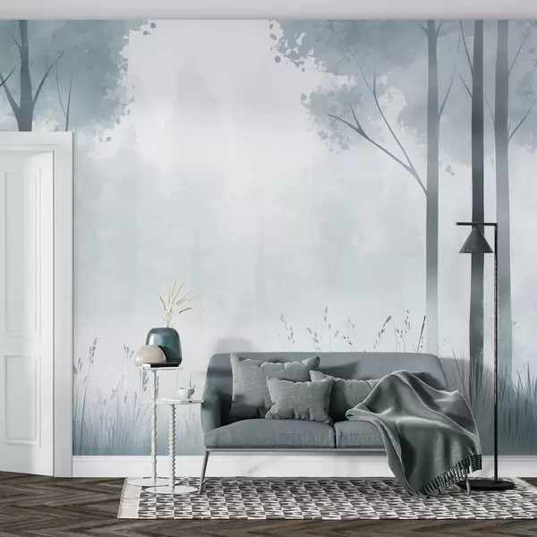 Fotomurales Acuarela bosque, niebla, árboles, hierba, paisaje natural, color gris Nr. w01563v3