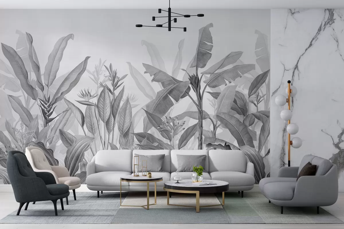 Fotomurales Hojas y flores tropicales en blanco y negro sobre fondo claro Nr. w01834v3