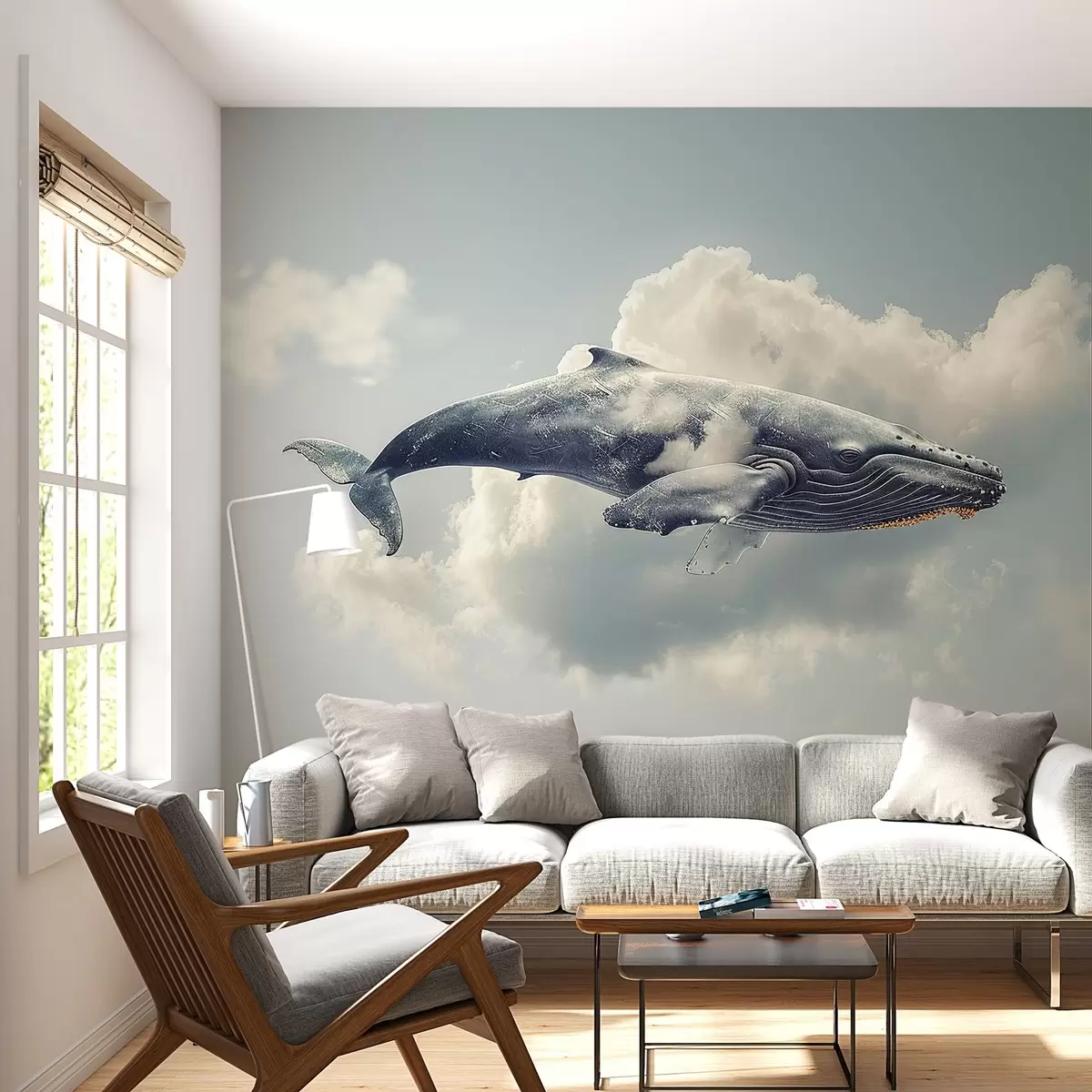Fotomurales Gran ballena de fantasía nadando entre las nubes sobre un fondo de cielo azul claro Nr. w01962