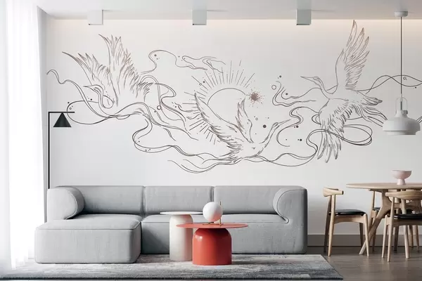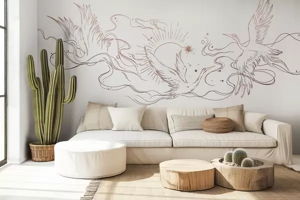 Fotomurales Pájaros voladores, dibujo lineal, minimalismo, paleta de colores beige Nr. w02022