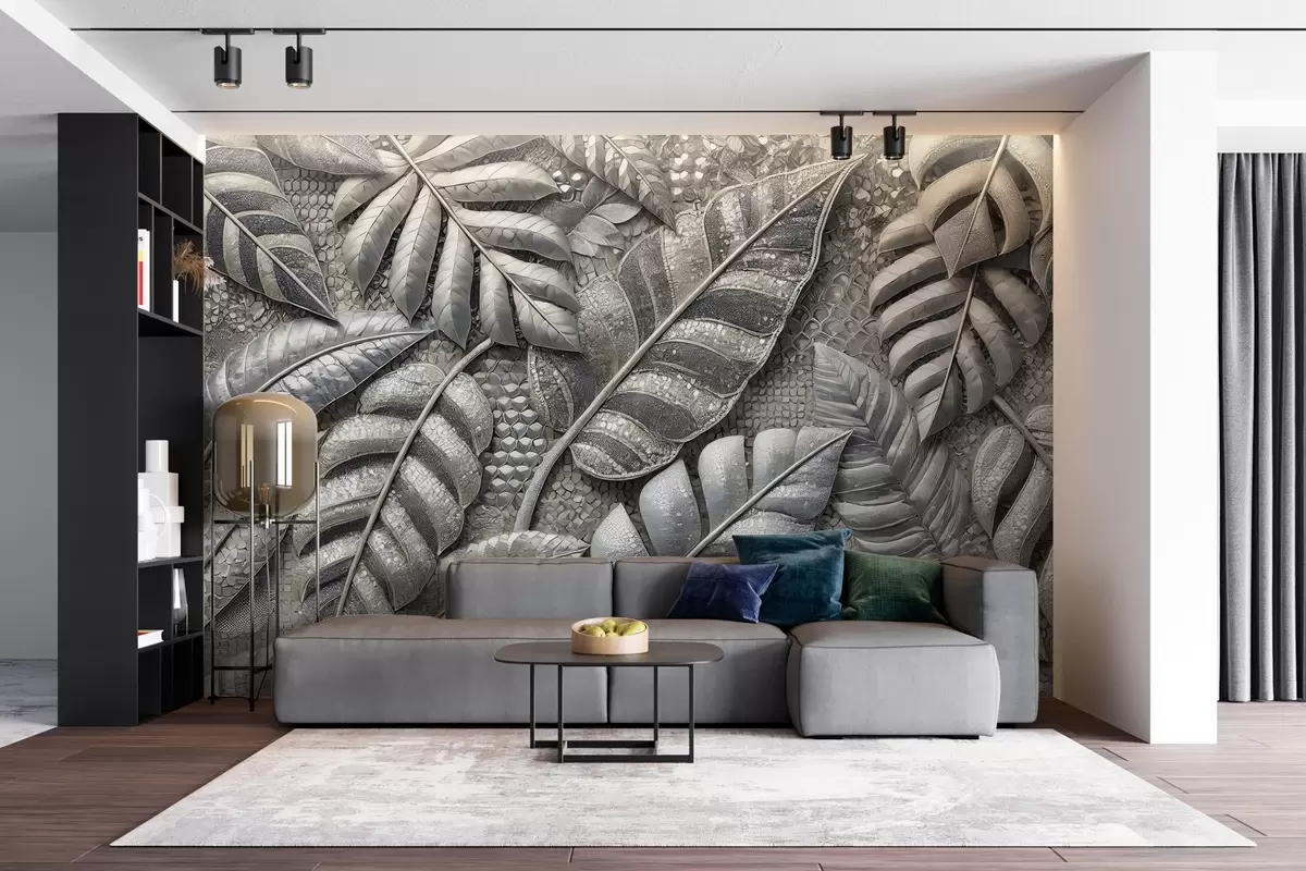Fotomurales Grandes hojas tropicales en delicados tonos plateados, en estilo mosaico texturizado Nr. w02135