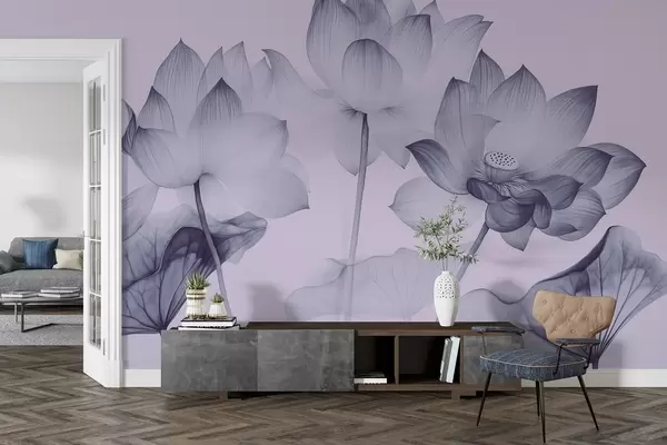 Fotomurales Tres lotos con hojas al estilo de la pintura china en color azul Nr. w02146v2