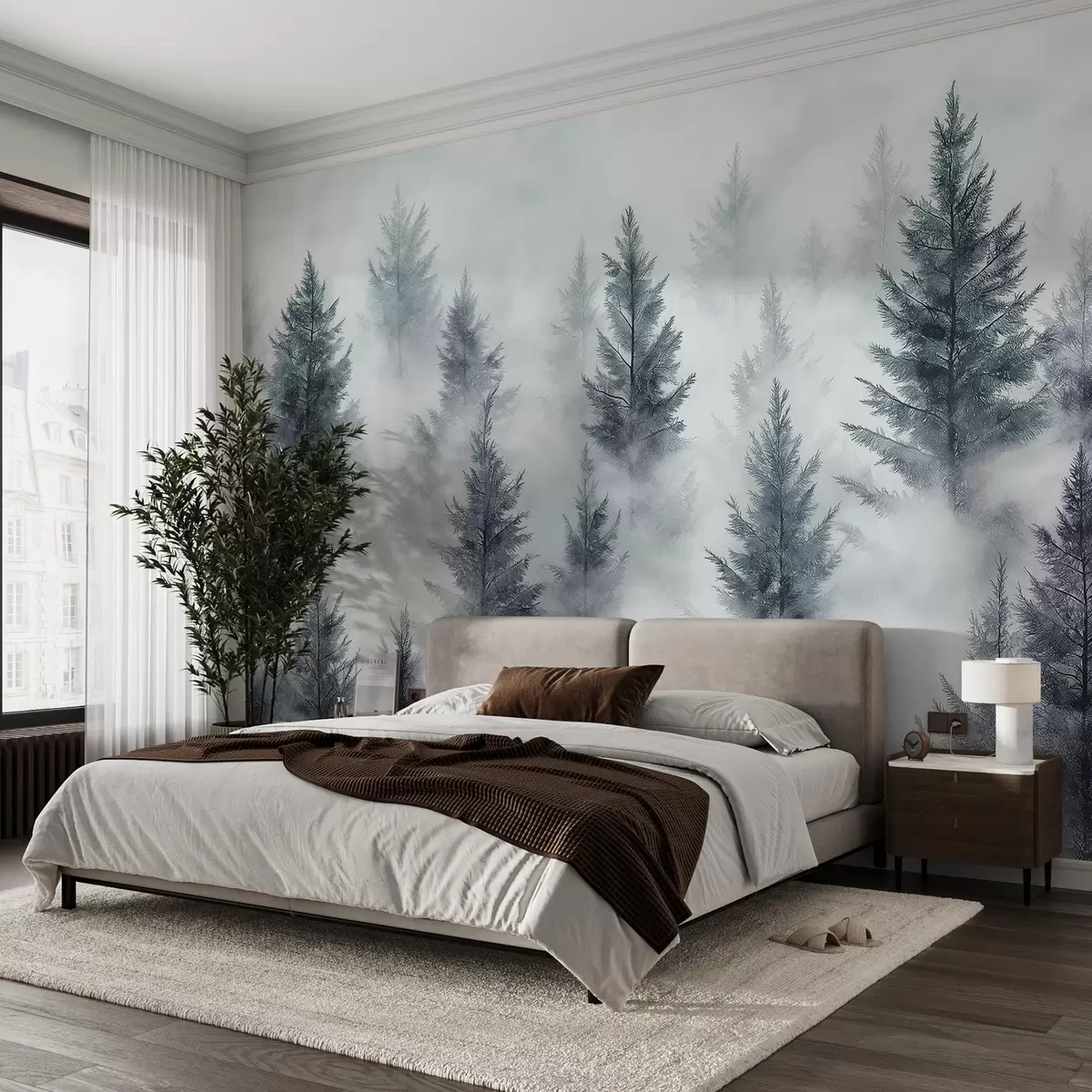 Fotomurales Hermoso bosque con pinos, niebla, paisajes de naturaleza, colores grises Nr. w02222v2