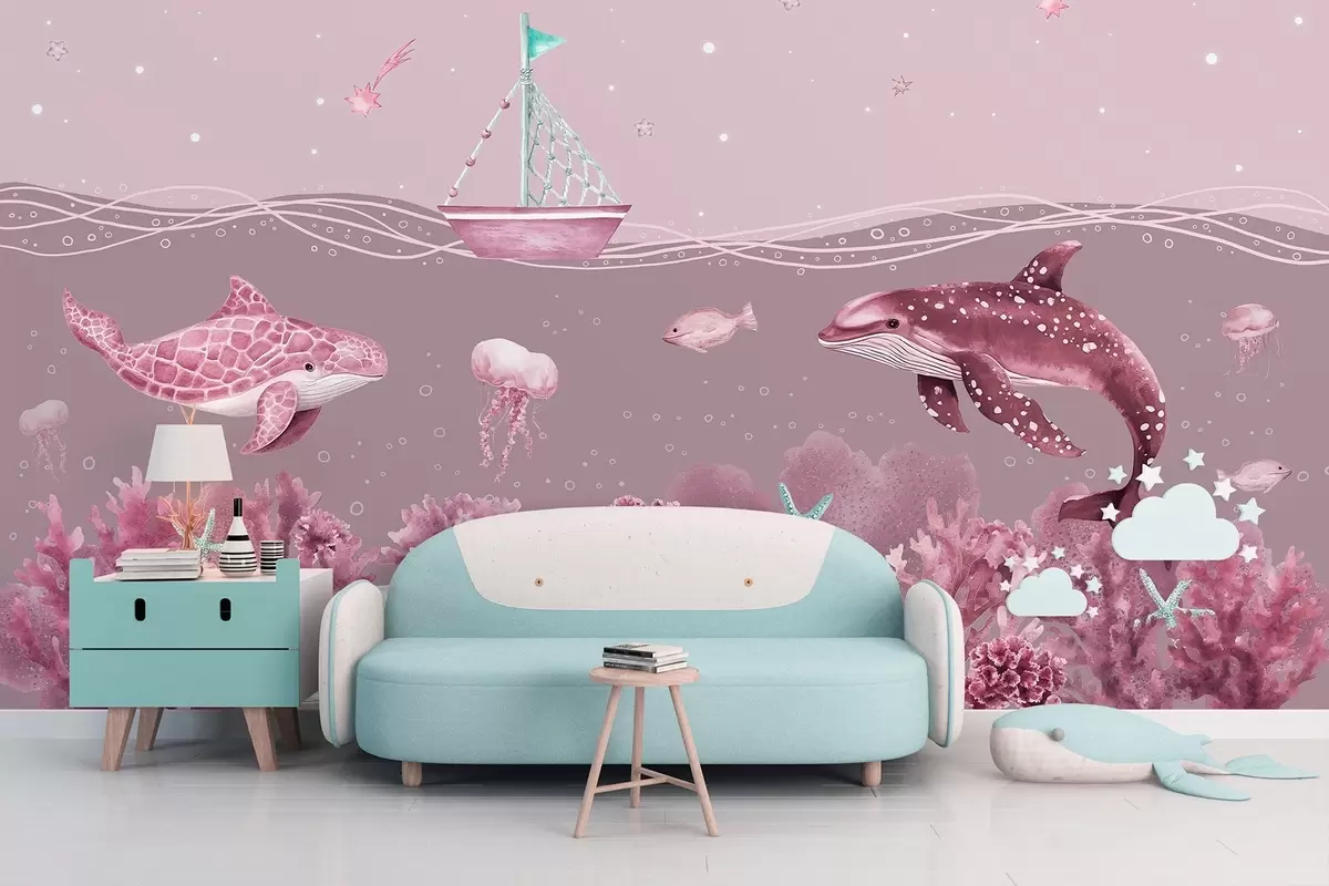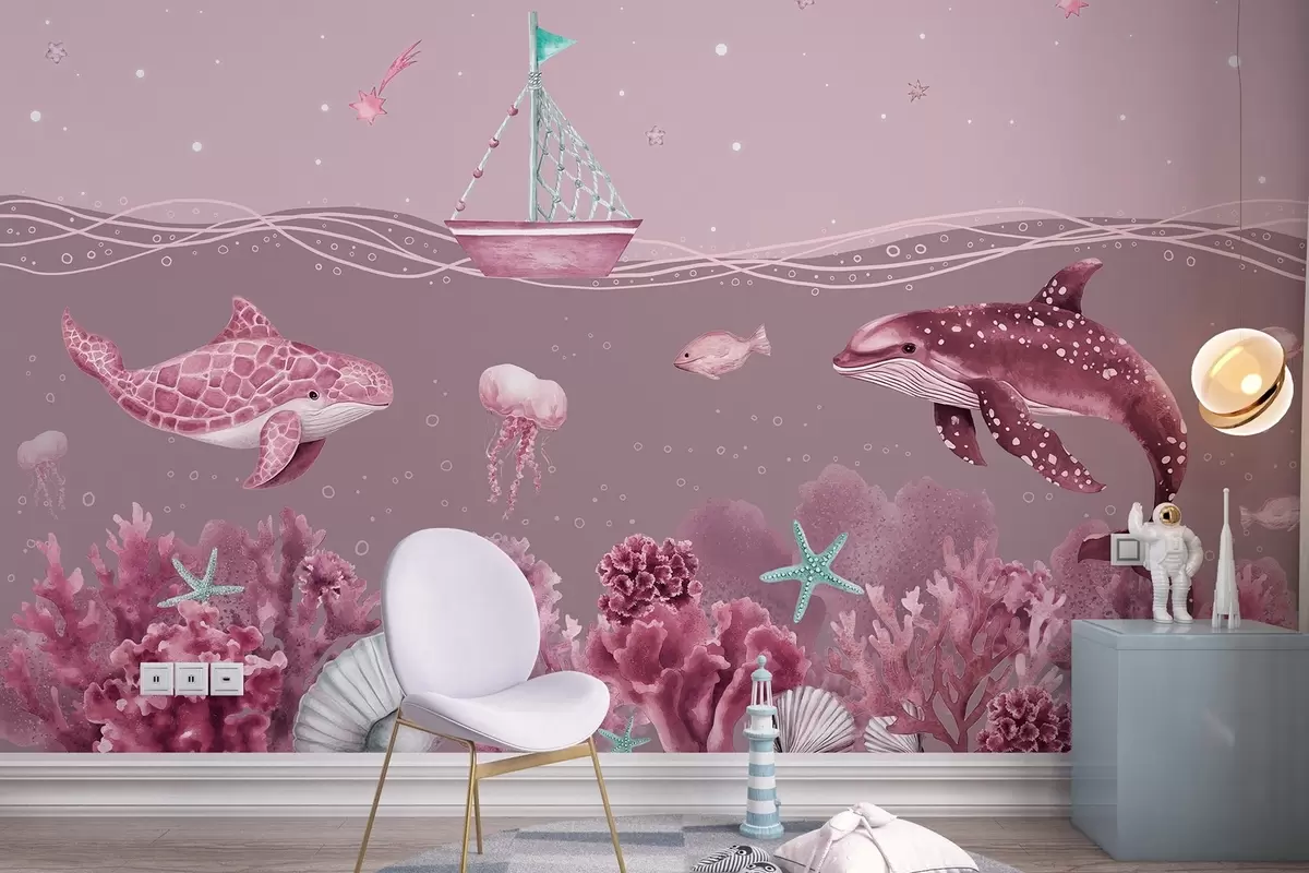 Fotomurales Vida marina, estilo acuarela, corales, barco, delfín, medusa, cielo estrellado, colores rosados Nr. w02310v2