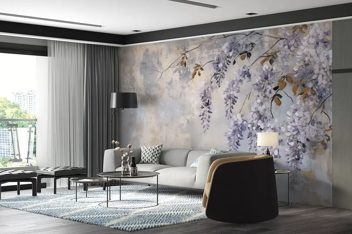 Fotomurales papel pintado texturizado en colores suaves y apagados con delicadas flores y ramas de glicinia. Nr. w02451