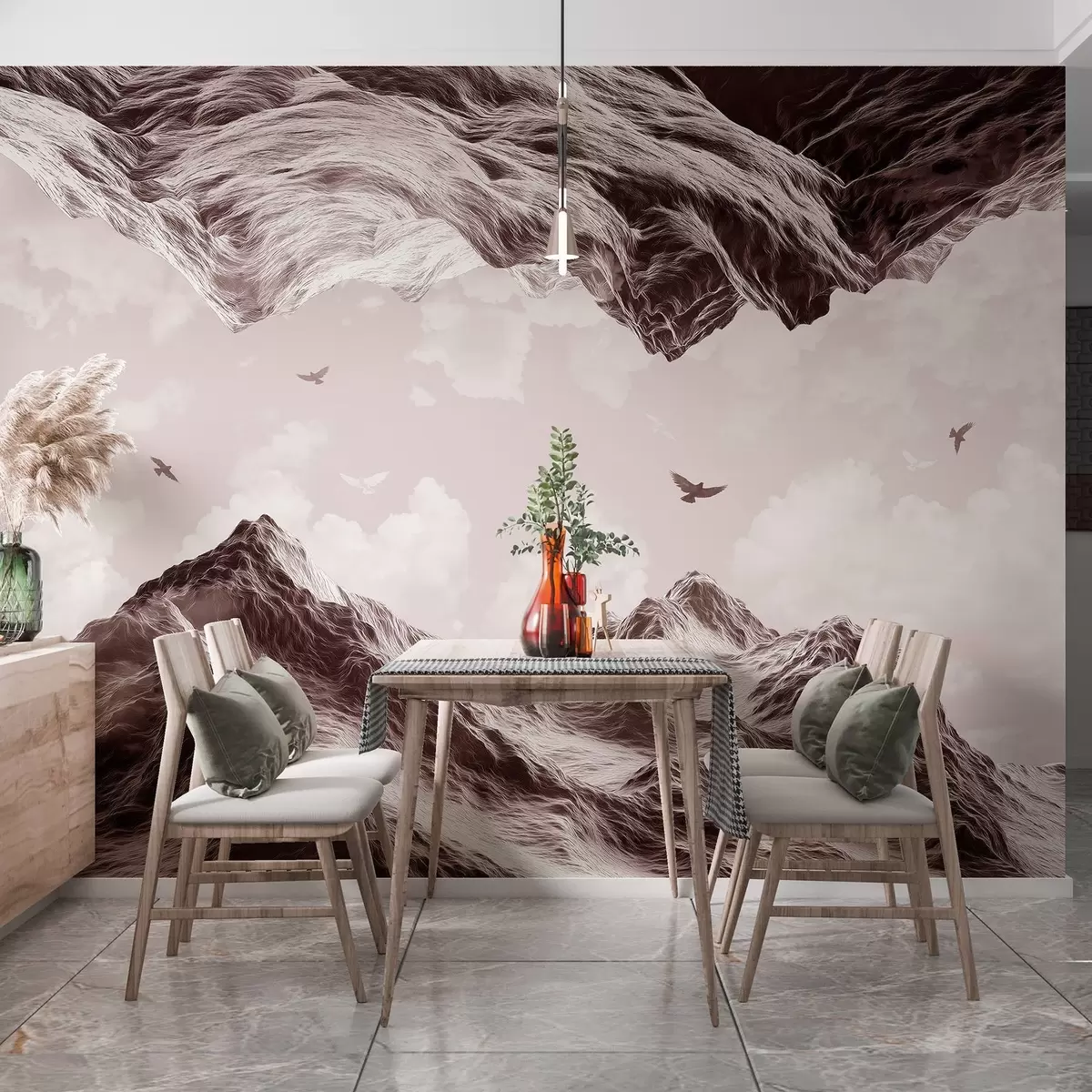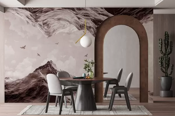 Fotomurales Paisaje de montaña, realismo, pájaros volando, naturaleza, nubes, colores marrones Nr. w02514v2