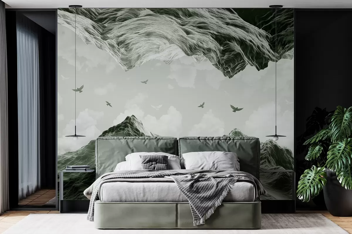 Fotomurales Paisaje de montaña, realismo, pájaros volando, naturaleza, nubes, colores verdes Nr. w02514v3
