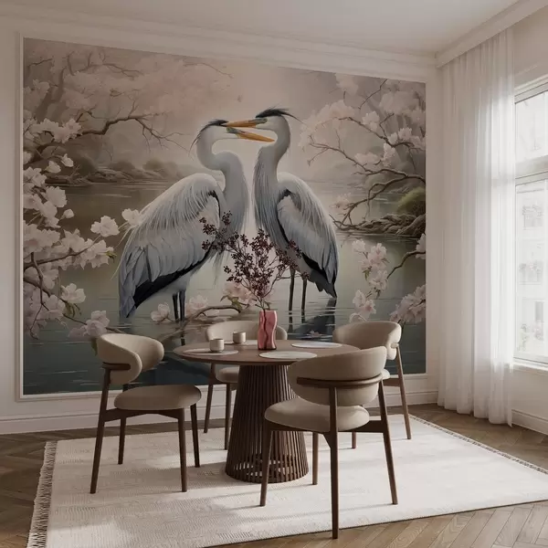Fotomurales Una pareja de cigüeñas en un jardín en flor Nr. w02621