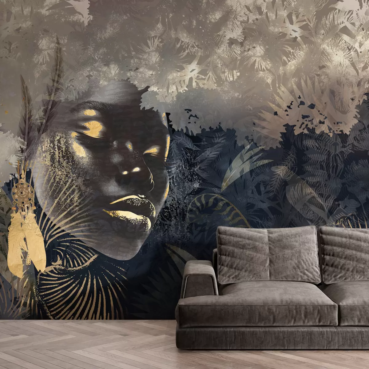 Fotomurales África mágica con selva tropical, elementos femeninos y vectoriales con tinte azul Nr. w02642v1