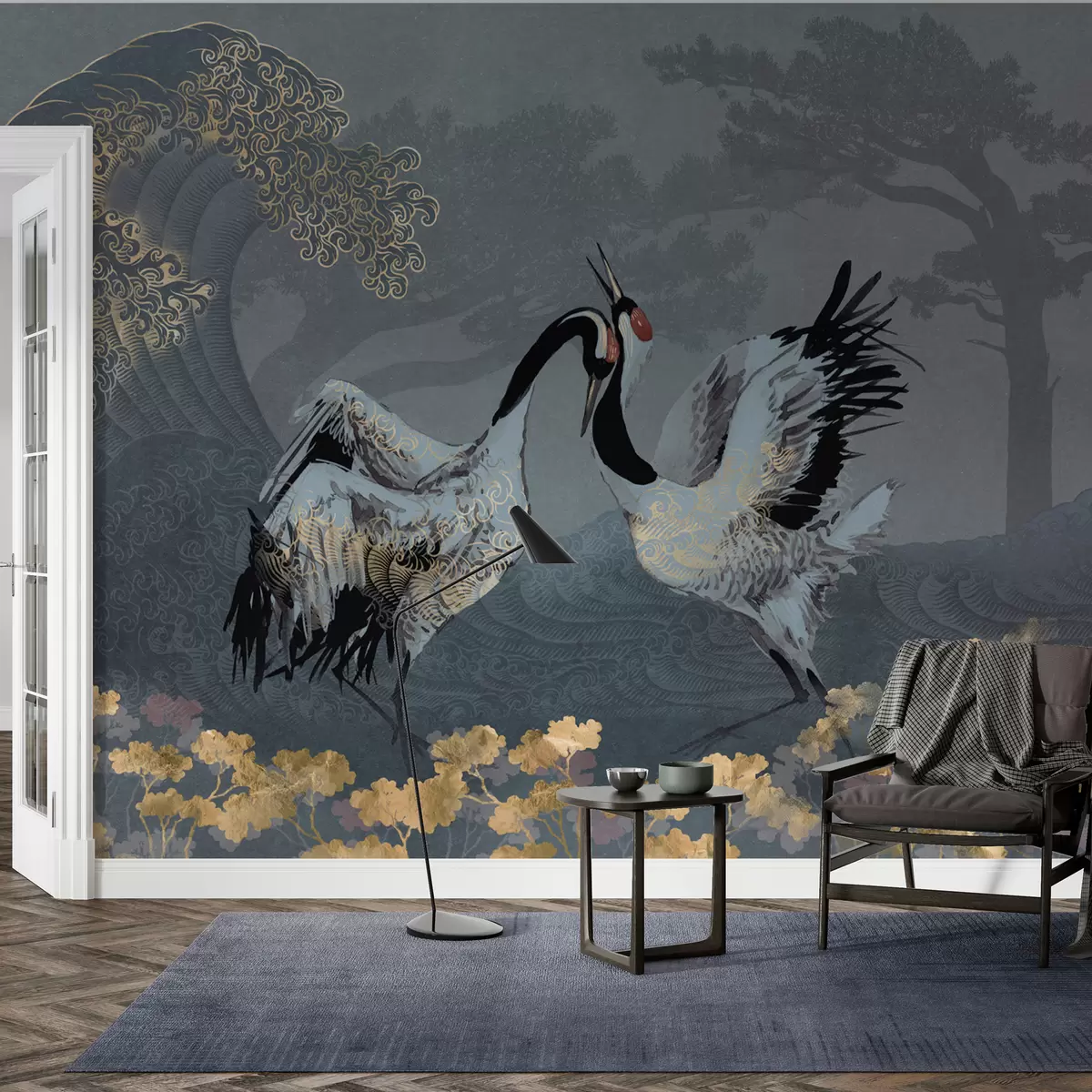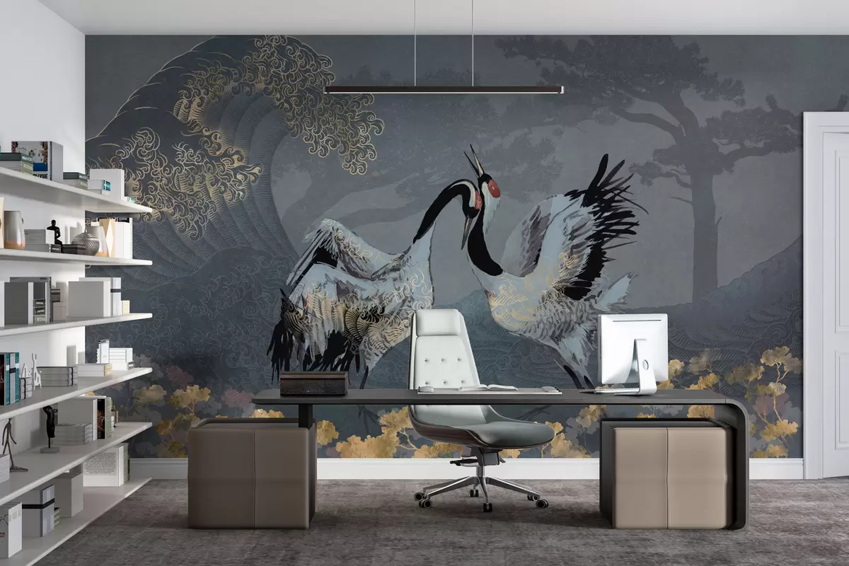 Fotomurales Grullas, árboles y olas con elementos de estilo chino Nr. w02747