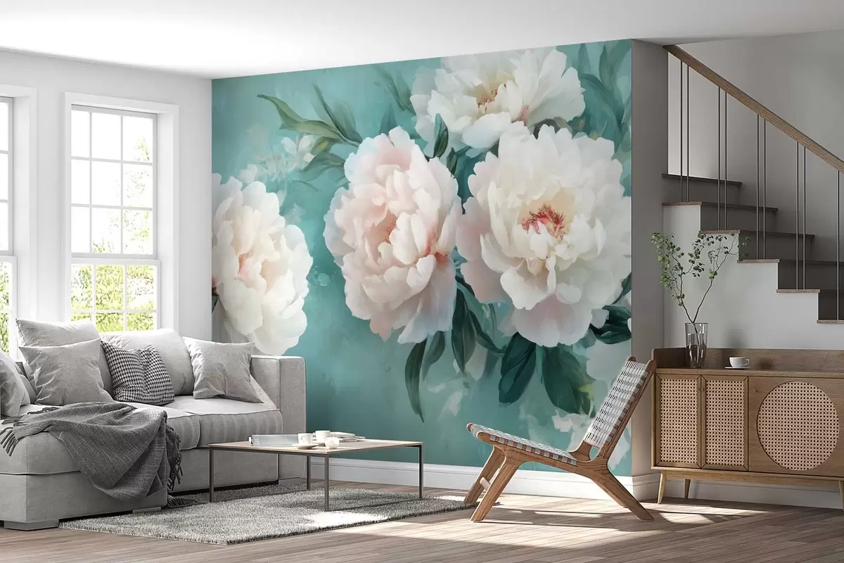 Fotomurales grandes flores de exuberantes peonías sobre fondo turquesa Nr. w02763