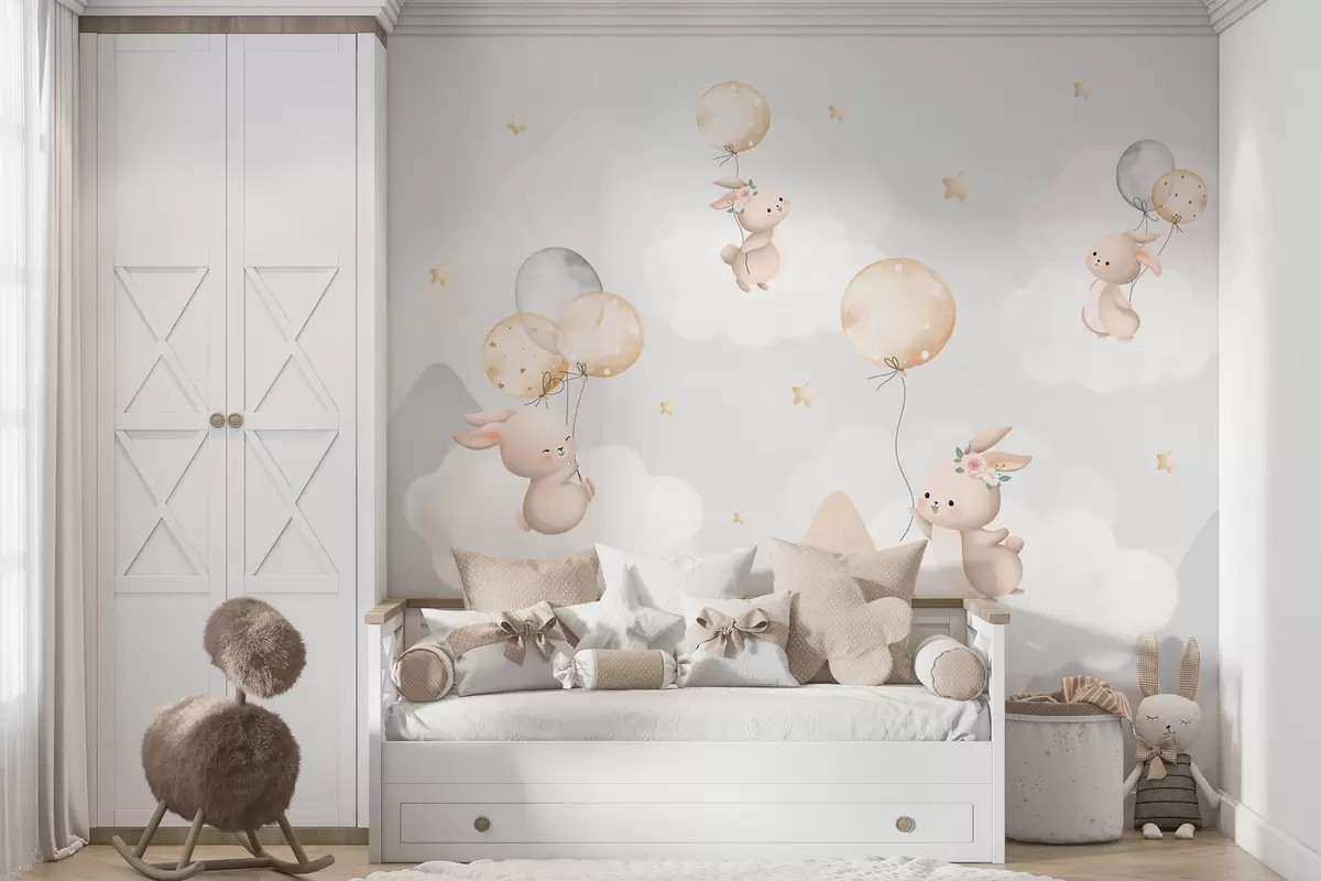 Fotomurales Conejitos con globos sobre nubes entre picos montañosos Nr. w03375v1