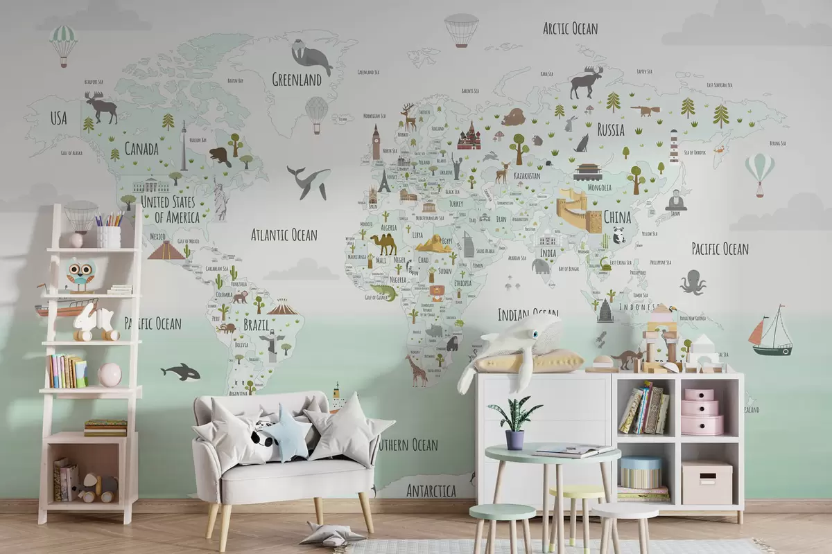 Fotomurales Mapamundi con animales y puntos de referencia Nr. w03410v2