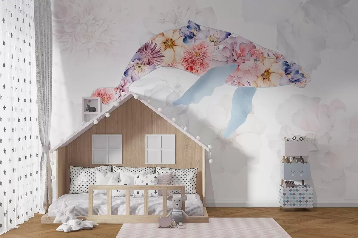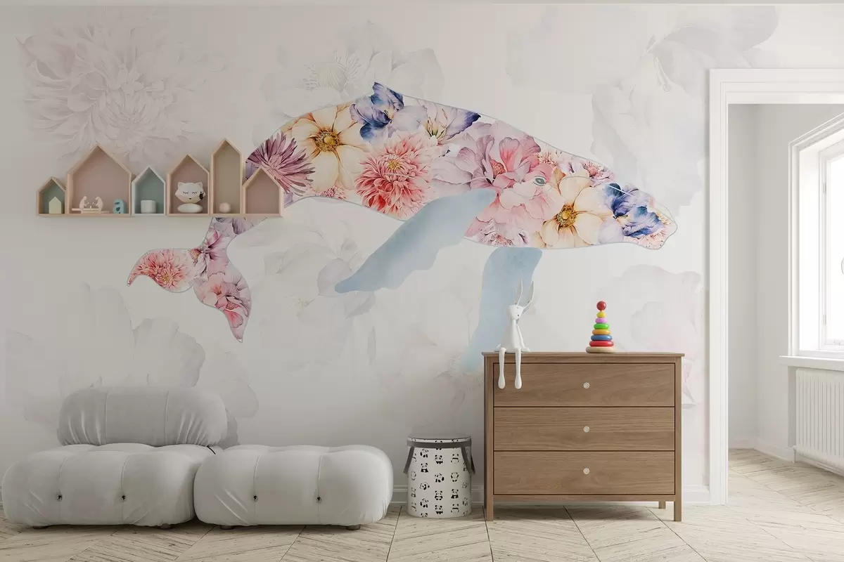 Fotomurales Ballena con flores de acuarela, animales del océano, minimalismo, colorido Nr. w03446
