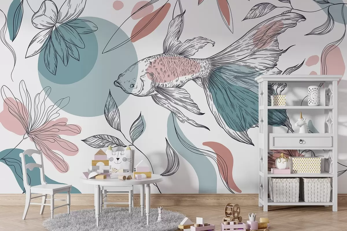 Fotomurales Dibujo lineal pez con flores, minimalismo, marino, floral, azul y rosa Nr. w03448v1