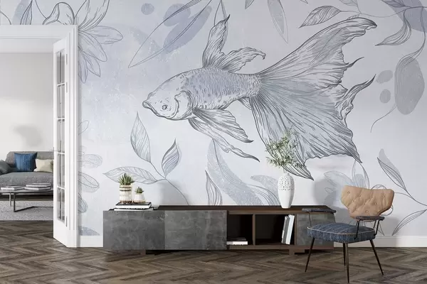 Fotomurales Pez con elementos florales, fondo azul, dibujo lineal Nr. w03517v2
