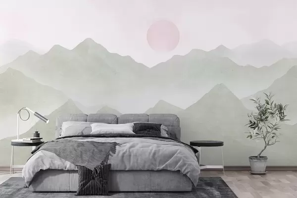 Fotomurales Paisaje de montaña estilo boho, puesta de sol, pastel suave, verde Nr. w03547