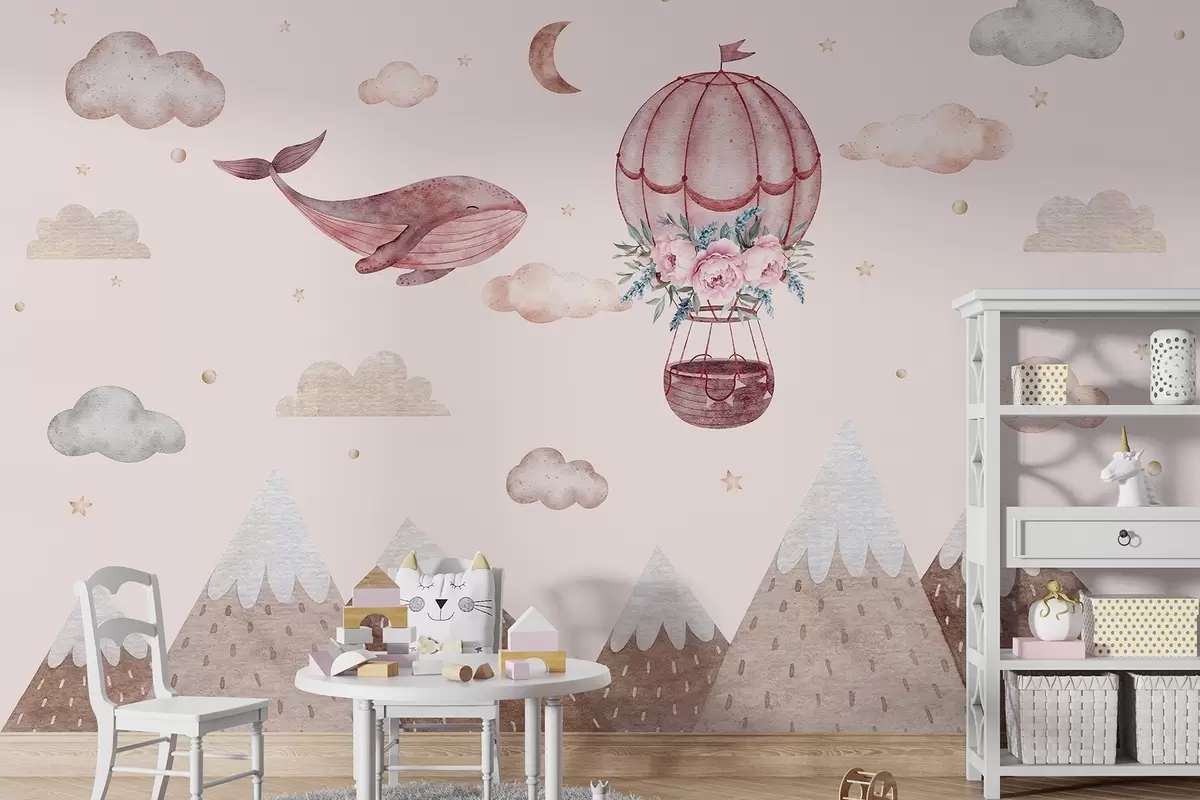 Fotomurales Ballena linda con globo de aire, cielo con nubes, montañas, estilo acuarela, colores rosados Nr. w03673