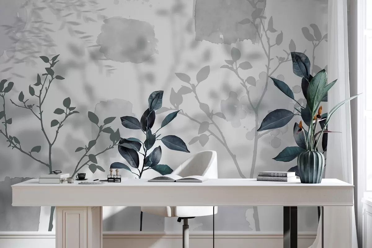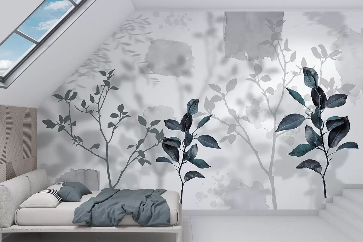 Fotomurales Hojas de limonero, ramas de arbol sombras, naturaleza, acuarela, azul Nr. w03910v2
