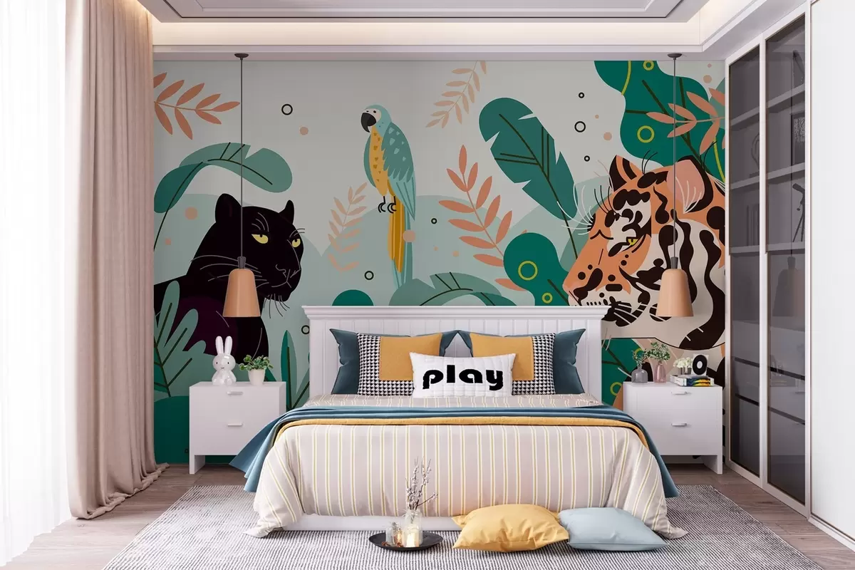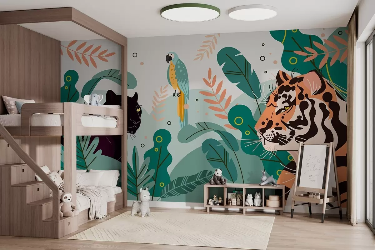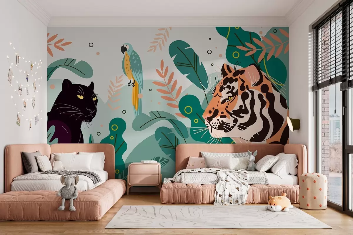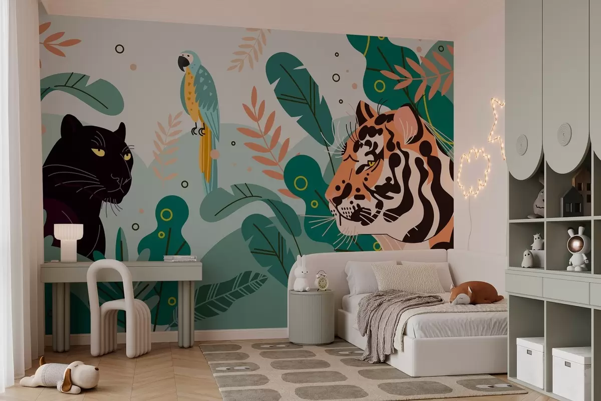 Fotomurales jungla con un tigre, una pantera y un loro Nr. w03958